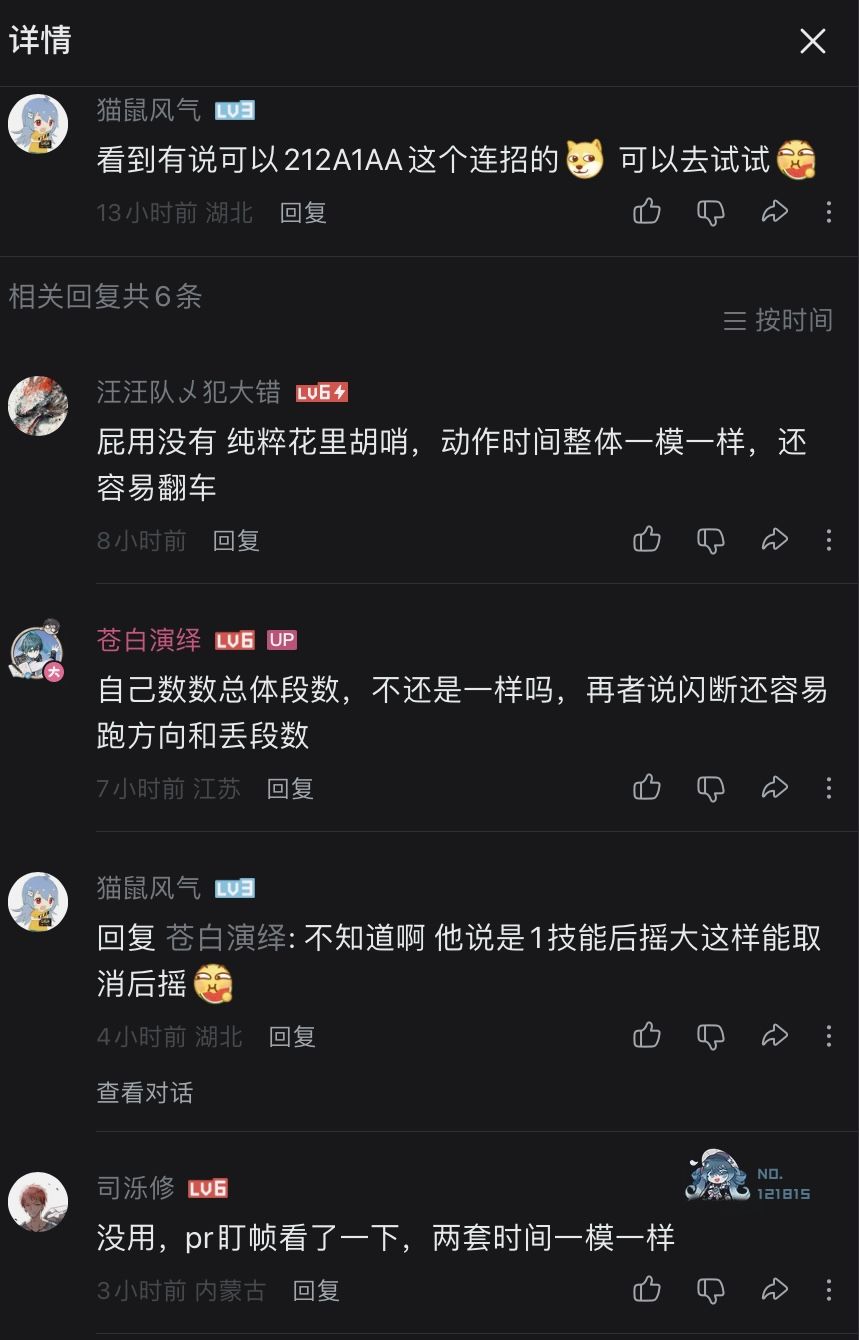 5.关于212A/1AA的话,我自己测下来1技能的第一段是完全没有后摇衔接第二段的,至于前摇的话你用1技能无论你是2技能接1技能,还是直接用1技能,都是有挥刀的前摇的。而且212A/1AA相比22A/11AA,212A靠近A的2技能是吃不到潜能1的10%暴击和20%爆伤的。