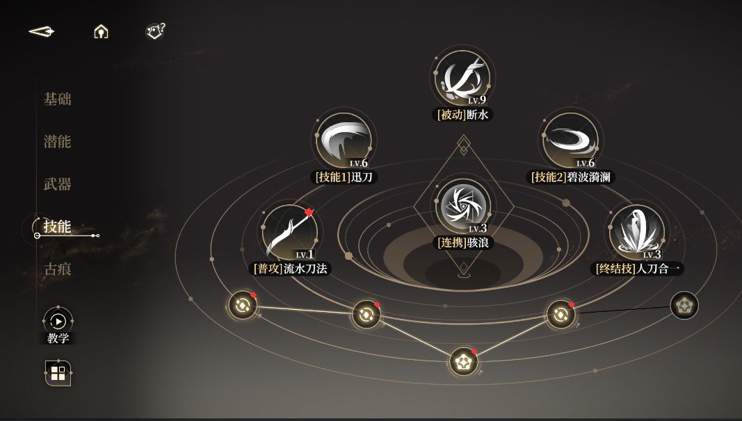 优先升满被动技能【断水】,伤害全在被动的强化普攻上。然后再升级技能1、技能2、大招,最后再提升普攻和连携。
