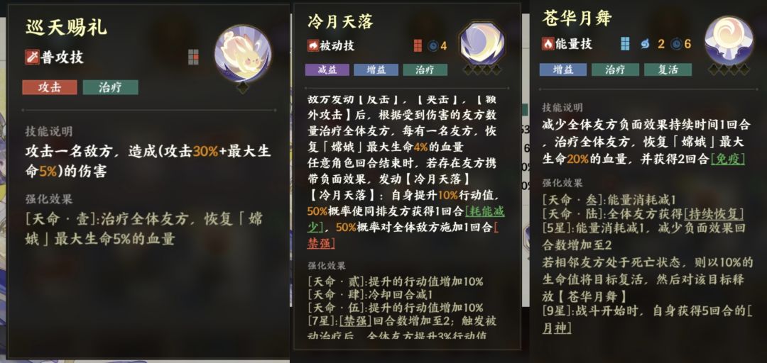 普攻全体奶,被动主要PVP用,PVE主要就减耗。大招复活要求相邻,站位尽量站中间,跟高星狐狸有冲突(能上6个角色就没事了)。5星够用,14天签到一个自选,200层一个自选,所以如果能歪一个,平民5星嫦娥不是梦。开服可以考虑整个带嫦娥的初始。另:碎片也有概率开出光暗。