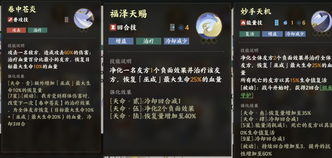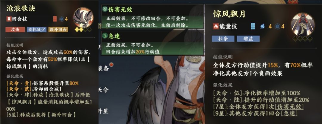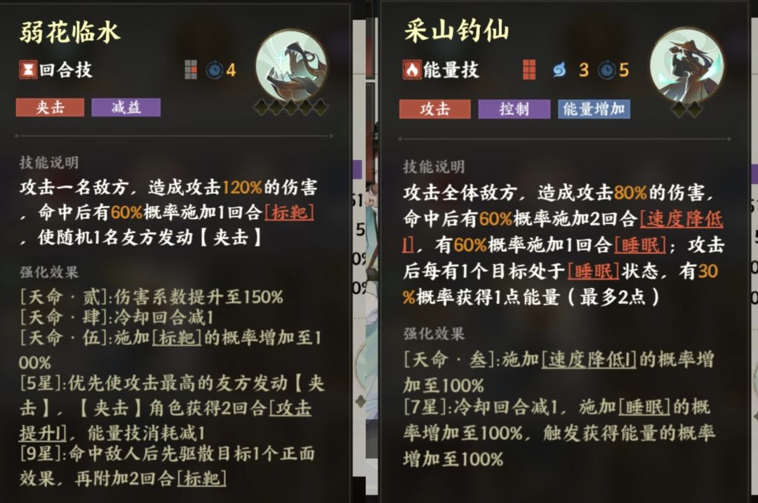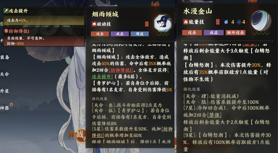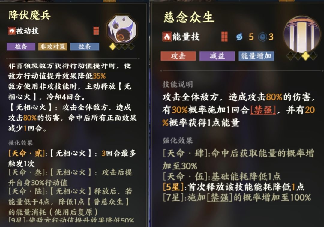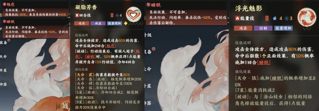 被动的魅惑减抗增伤能拐灼烧、流血,以及部分特殊角色(杨戬)。7星加天三是目前少有的稳定打火机,但7星前对队伍的提升有限。还有就是“相邻同排”限制站位,跟嫦娥有一定冲突。