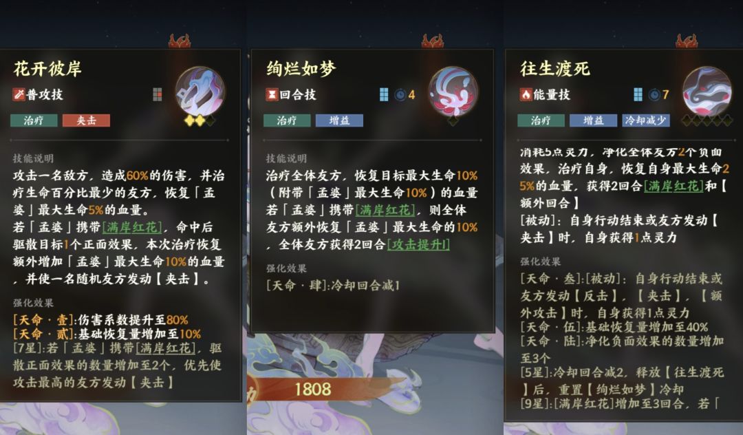●剩下几个就不放图了,杨戬偏PVP,主要加点废,回合技只减被动冷却不减主动冷却,设计思路应该是通过被动来拉条,那PVE就比较一般了。大招击杀禁止复活明显针对PVP,击杀减冷却PVE用处一般。不过绿色系没几个输出,歪了打克制也能用,但还有性价比吕洞宾在。