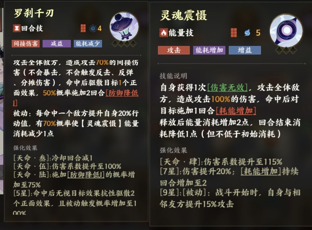 被动机制优秀。队友消耗能量就有输出,在前期能量稀缺的情况下可太好了。而且还是主动释放,满灵力直接插队,PVP可用。PVE还有加攻减防,5星还有大招减能。普攻标靶还有增伤减闪。3星起用5星好用,PVP7星、9星更好。