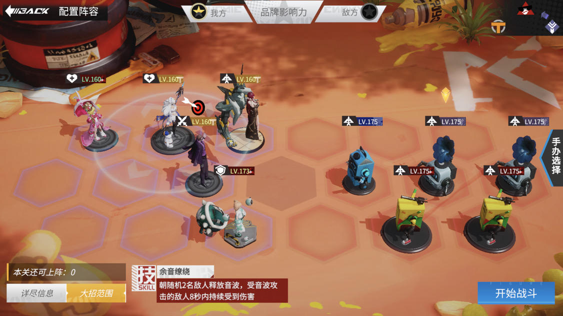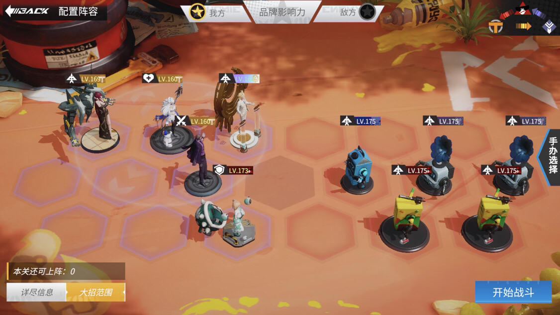 下面是我的站位,莉可被伽拉克制,所以给他放在了最下面。恶魔靠吸血和苟命徽章能挺住3回合基本上就能过。没刷出来攻速套,有攻速套或者吸血套的话恶魔应该更能抗