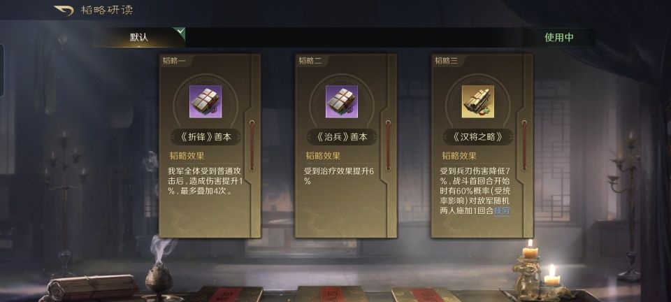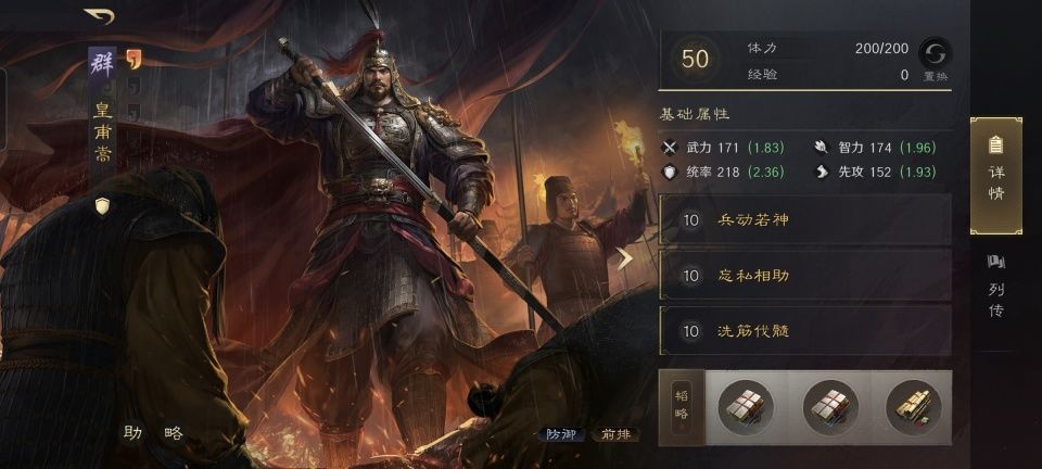 皇甫嵩战法:兵动若神+忘私相助+洗筋伐髓。韬略库:折锋善本+治兵善本+汉将之略(专属)。