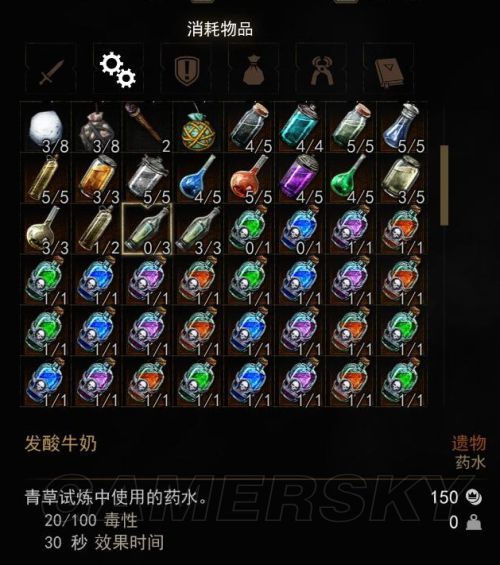 其中还有6种小魔药比较少见,同为遗物没有高等:杀人鲸3、熊费洛蒙2、爆裂霉菌解药3、发酸牛奶3(青草试炼种使用的药水,这个我没碰到过,估计是任务物品);另外有水鬼费洛蒙2(魔法道具,杀沼泽女巫制作)和孽鬼费洛蒙2(大师道具,我没碰到过)。