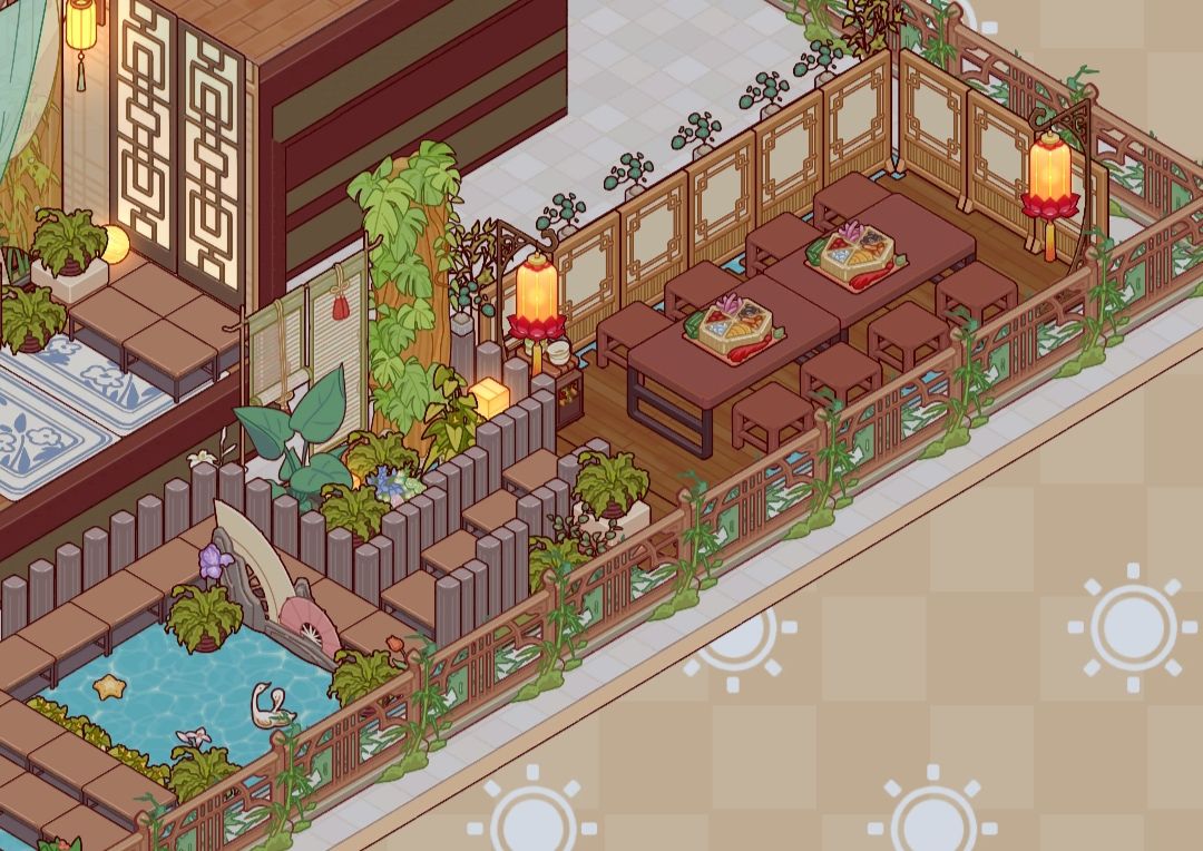 二层中间是水系庭院,利用小木桌组成回廊,中间有假山小景