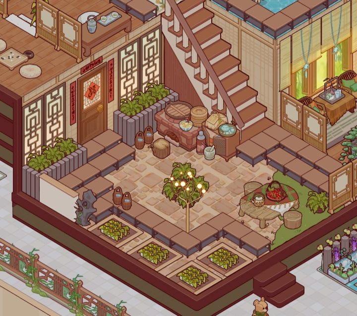 一层左侧是农家小院,利用小木桌分割成菜园和小院两个区域,体验农家生活