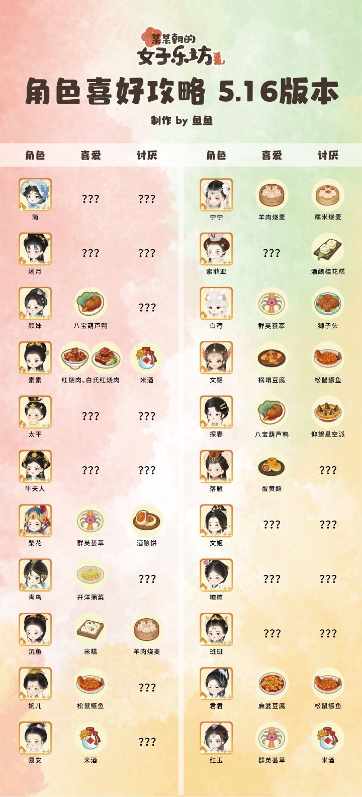 某某朝的女子乐坊全角色喜好攻略 5.16版本