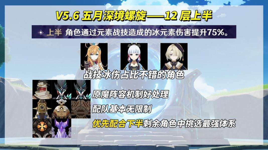 本期上半场buff‘元素战技造成的冰元素伤害提升75%’,契合此特性的角色如下「爱可菲、菲米尼、神里绫华」,使用这三位数值提升显著,可事半功倍。