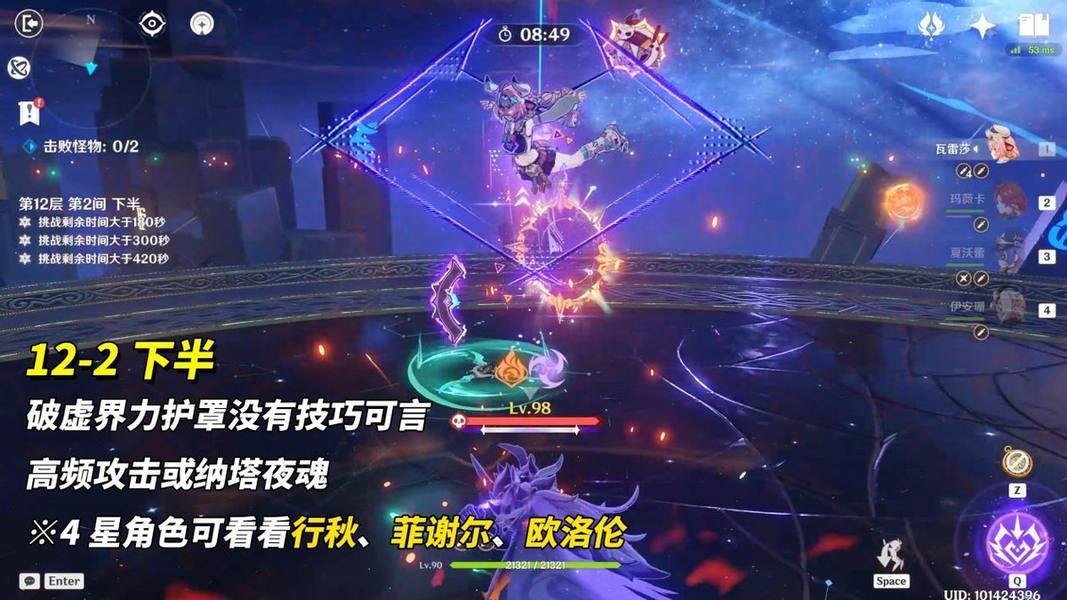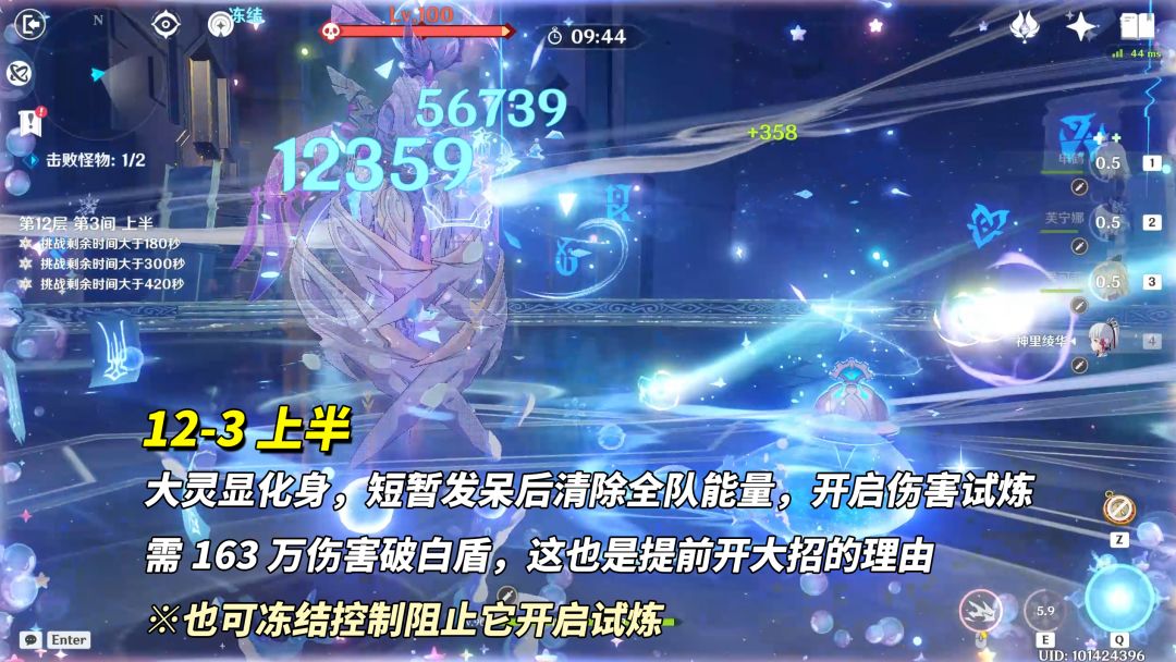 【12-3上】临近消灭第1波遗迹重机时,尽量将全队元素爆发能量补满。进入第2波立即将关键元素爆发施放,避免大灵显化身开启试炼清空能量,影响你输出轴。试炼期间会有等效163万血的白盾,输出硬灌可破,返还大量能量。