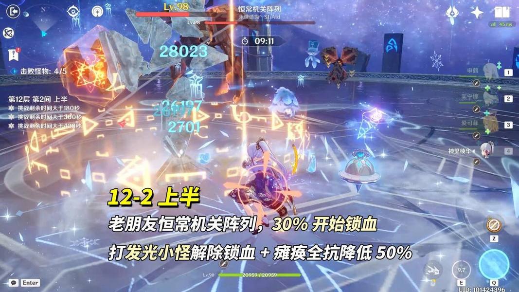【12-2上】前2波枫丹机关小怪,血量30多万,可适当留点儿难充能的技能,方便在第3波开启立即爆发。这期恒常机关阵列血量309万,其余机制不变,依旧为30%血量锁血召唤分身,消灭发光分身解除本体锁血,并全抗降低50%。