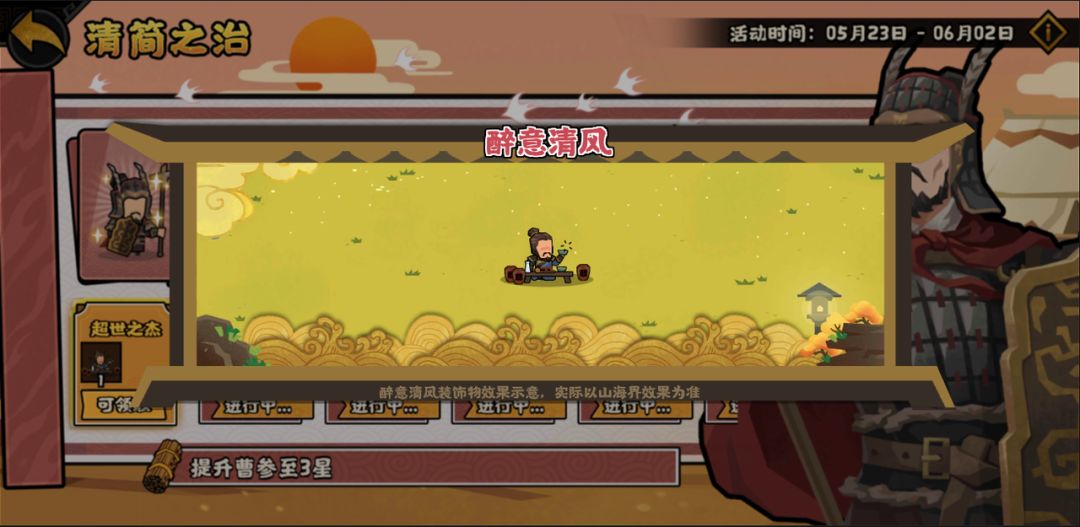 5月23日至6月2日,曹参“宁一海隅,萧规不移”名臣主题挑战活动同步登场!参与活动并完成对应任务,即可获取丰富道具奖励,还有全新的山海界动态摆件“醉意清风”。