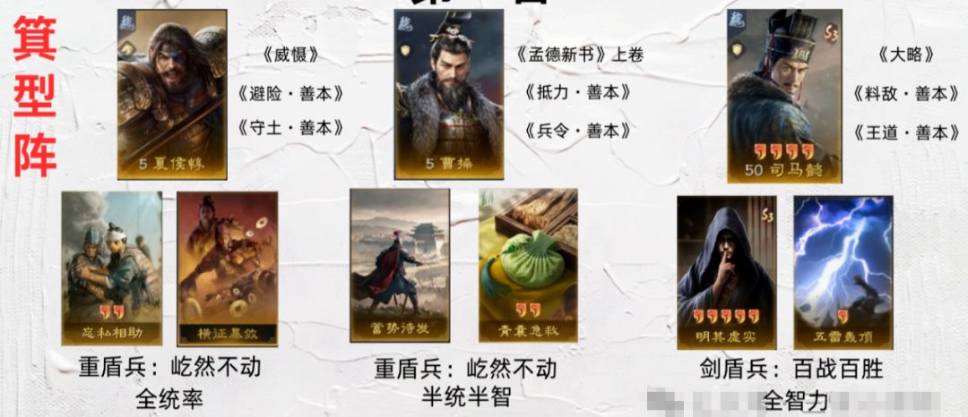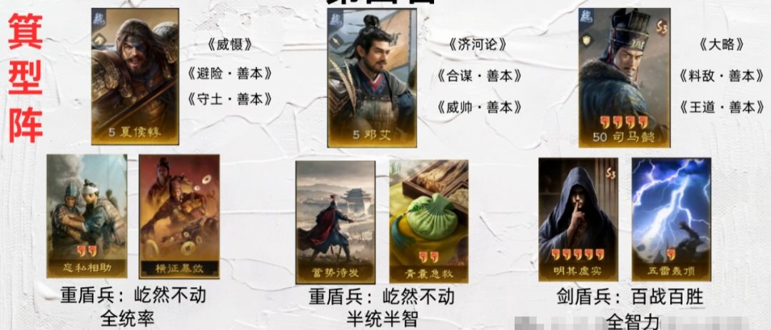 第四名的双减司马(夏侯惇 + 邓艾 + 司马懿),是经典的拖回合阵容,用五雷和明其虚实来补输出。它的优势是奶量充足,输出也稳定。