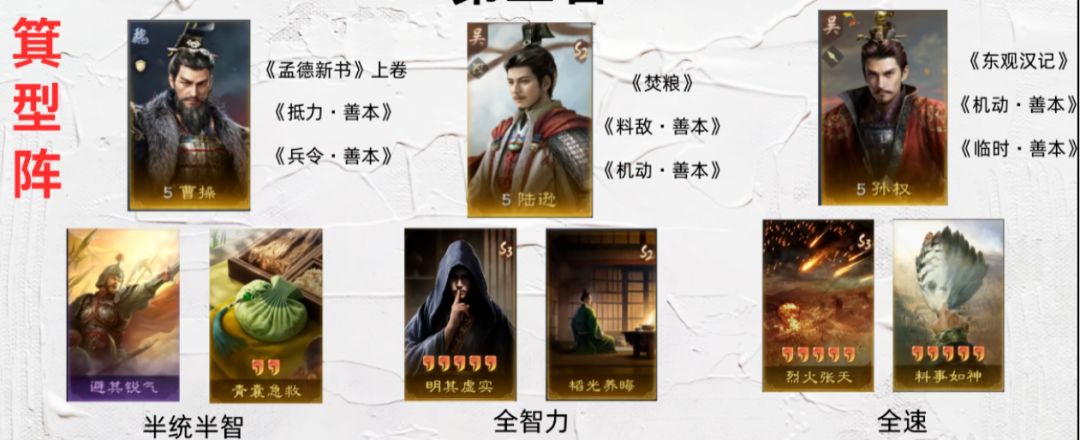 第八名的半肉嘟嘟(陆逊骑兵变种),有虎符加持就能转骑兵,专门针对性抓司马懿。它的配置是孙权带青囊和料事如神,鲁肃带横征暴敛和烈火焚营。战术就是避开骑弓模型,专挑骑盾盾打。