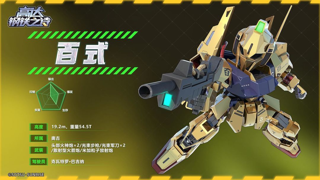 欢迎回到机体博物馆,这期我们会为大家带来一台“金光闪闪”的机体——百式的详细介绍和基础攻略。百式与Z高达一样,来自动画《机动战士Z高达》,是由克瓦特罗·巴吉纳驾驶,与Z高达一样同为奥古的主力机体。