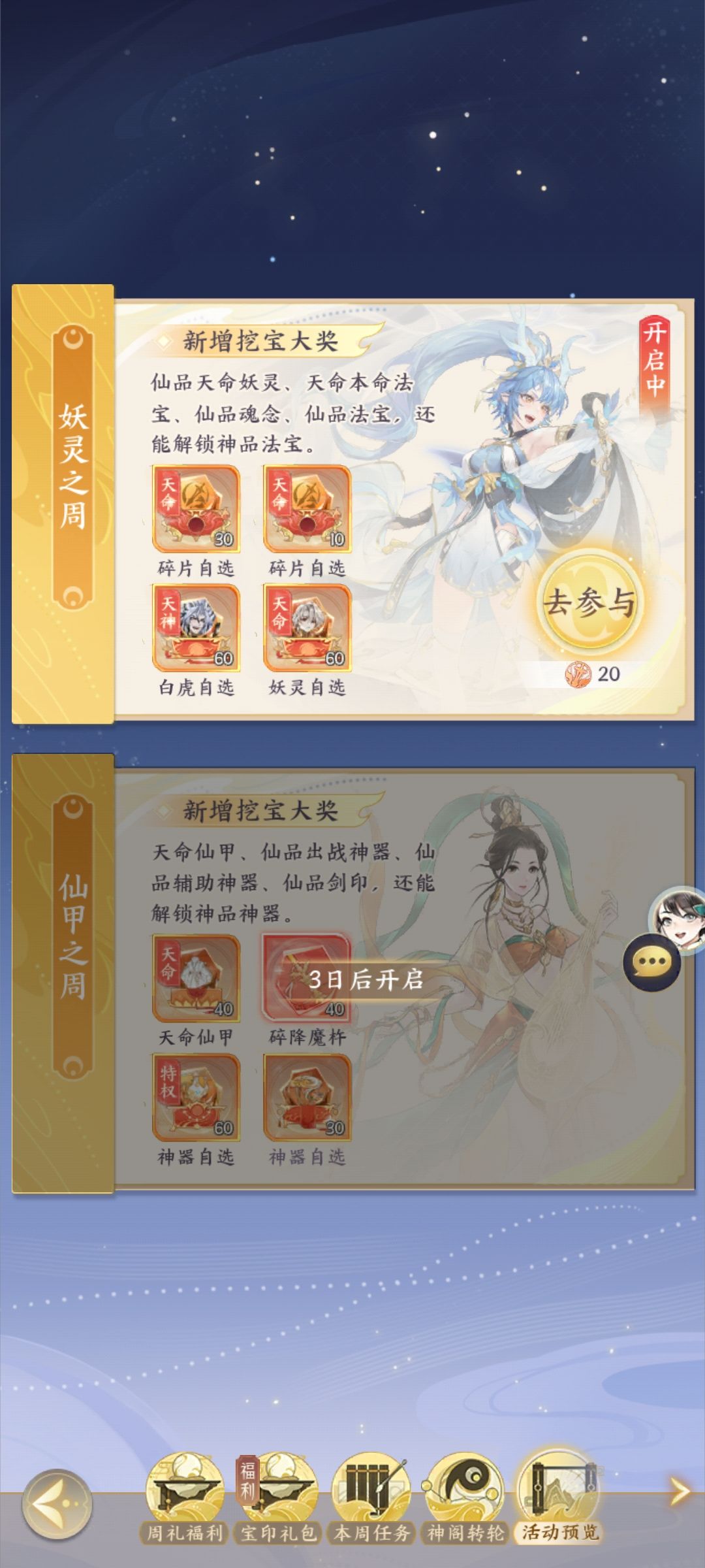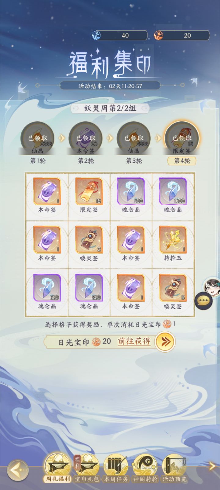 游玩到一定天数会解锁周活动,在这个活动中,我们可以使用日常任务获得的日月印进行翻牌,从而获得大大小小的道具奖励,不用担心月印不够哦,点击下方本周任务完成即可获得大量当周日月印。