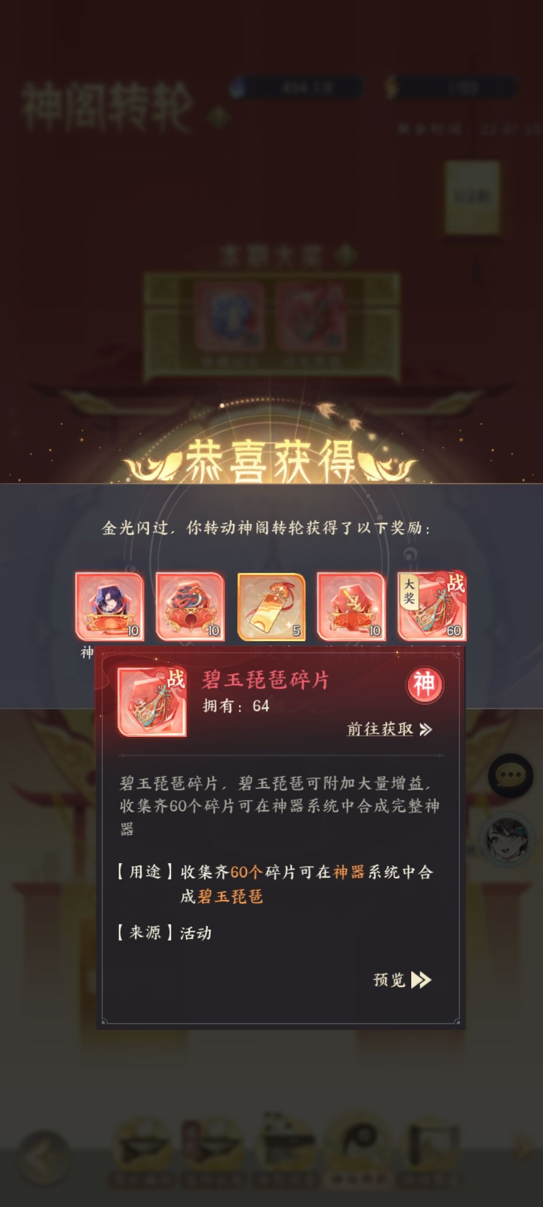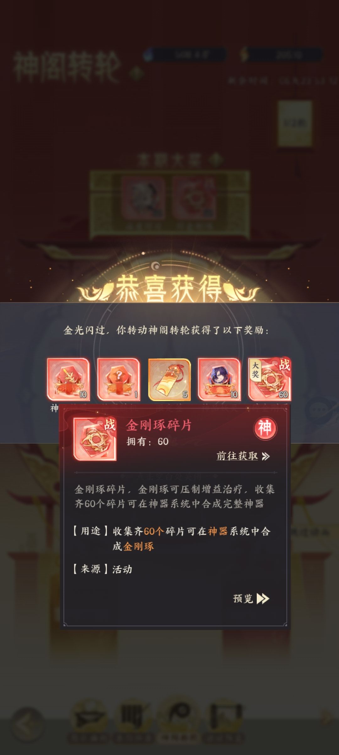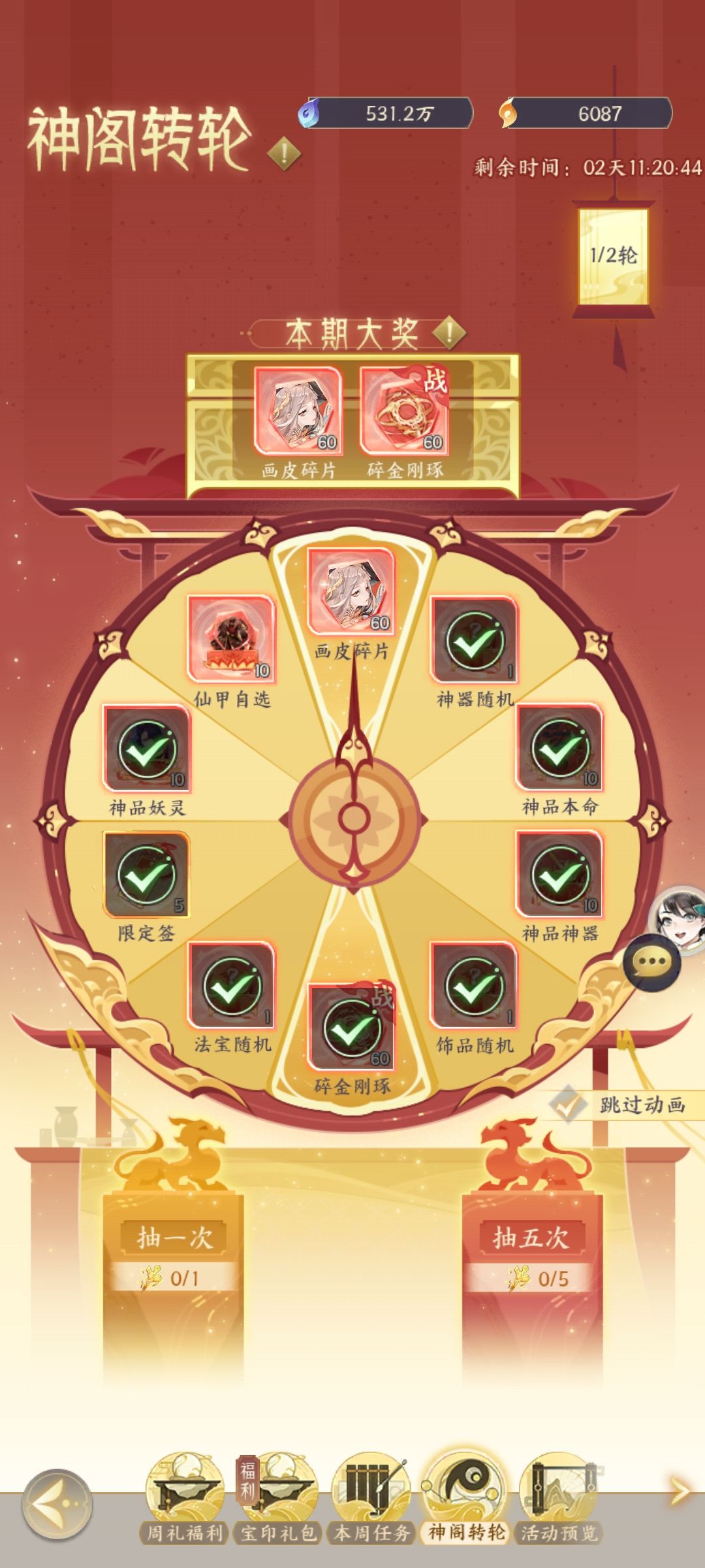 分牌翻牌总共分为两轮,每轮有4组,其中可以获得8个转轮印,可以在下方,神格转轮中抽取出战神器(我这边两周,两个神器都抽到了啦)(转轮印可保存,留到下周再抽)因为每周只可获得8个转轮印,想要抽满两轮的建议留三周哦(运气好留两周就行)