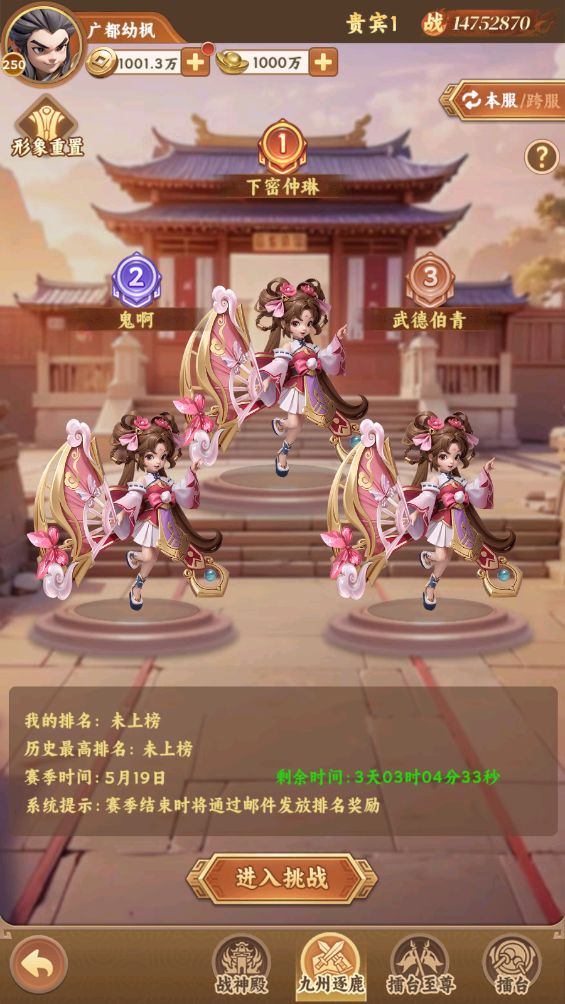 5、九州逐鹿(跨服)结束后九州币将自动结算为擂台积分,可用于擂台商城兑换道具。