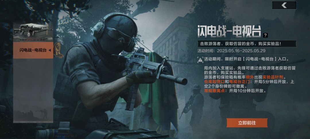 活动页面限时开启【闪电战-电视台】入口,游戏对局时长缩短至25分钟。局内加入支援站,新增游荡者巡逻队,先锋在战局内击败游荡者可以获取仿冒的金币,购买实验品。游荡者和保险箱有概率额外出现实验品针剂。