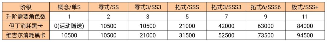 图中已计入活动赠送和抽一送一,例如但丁升SS3需要获取3只,但活动赠送1只,抽1只给2只,实际只需要抽取1只消耗10500黑卡。
