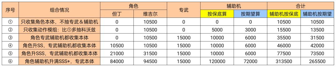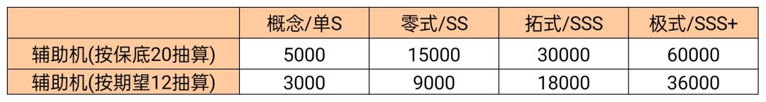 ③ 辅助机有重复抽取的升阶系统,但升阶不绑定机制,可视自身强度需求决定是否重复抽取。下图为辅助机各阶级消耗(分按保底和期望算两种):