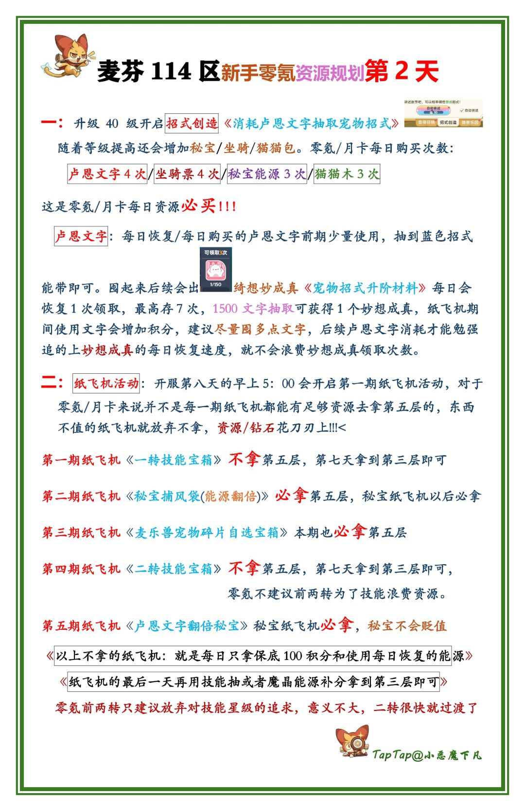 周年114区第二天《新手零氪资源规划》每日资源购买/前五期纸飞机