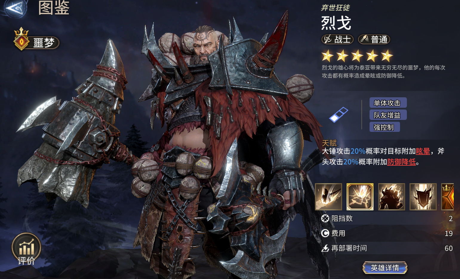 神器推荐选择罪恶之眼,在击杀敌人后可额外提升伤害,进一步提升清场效率。四、总结烈戈作为二代噩梦领主,是目前最值得抽的领主之一,塔伦功能定位与天使、玛格达相当,拥有十分出色的AOE输出能力。这个卡池的2个UP英雄都十分不错,有远古召唤的都可以抽。