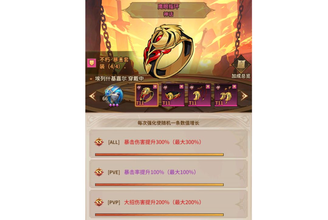 上古圣饰分为 指环,腰带,护符,耳坠,每件首饰都有基础属性和三条被动词条,基础属性随着首饰品阶的升高,数值就越大;三条被动词条则可以通过强化材料去强化数值和进阶,一般强力的有增加暴击率,暴击伤害,闪避率,攻击力,命中率,反弹率等词条,比如指环位置的暴击伤害词条,ss评分的词条强化后能增加300%的暴击伤害,这里的圣饰强化就是在300%的基础上再一次增加强化属性,最高可额外提升100%