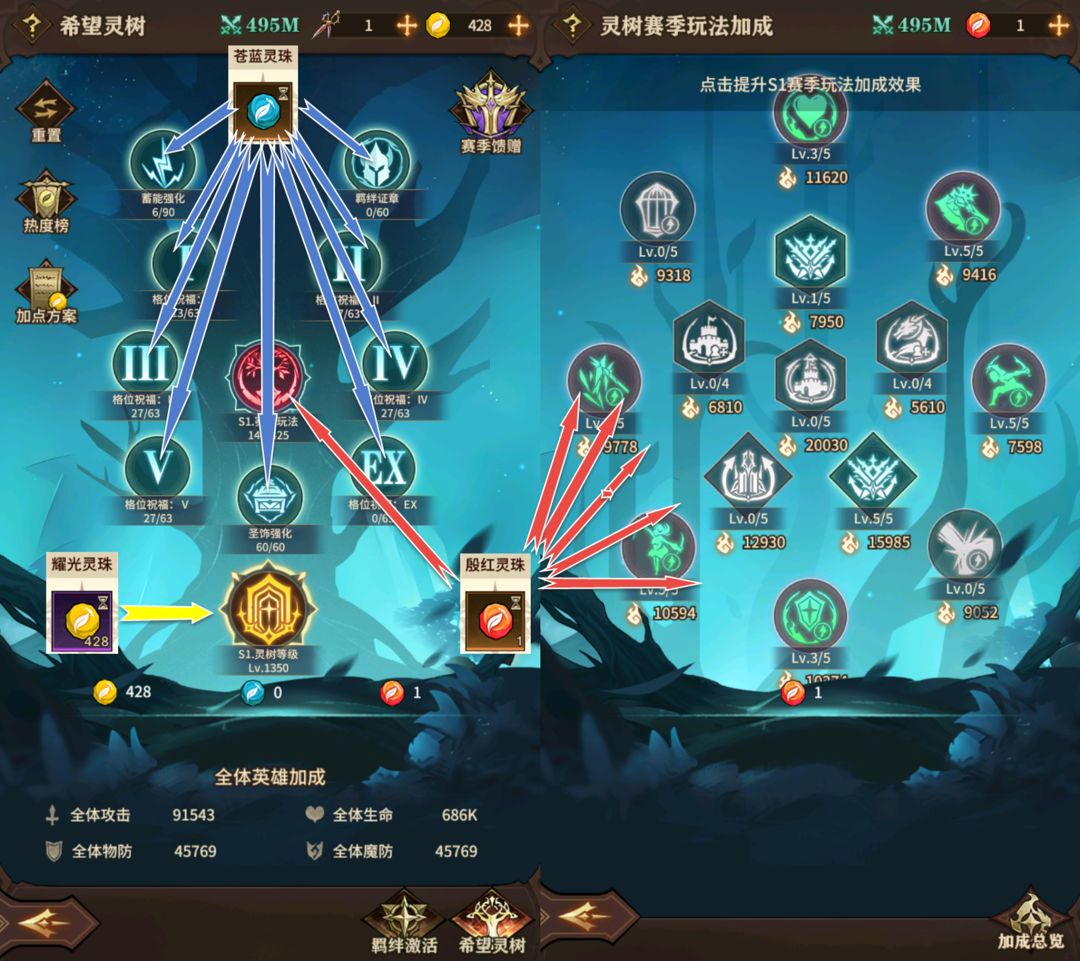 大致总结下,初期尽可能多的去提升灵树等级,获得属性加成 和苍蓝灵珠,再用苍蓝灵珠去升级队伍加成中的各个强化,优先3号位的治疗转攻,5号位的伤害加成。