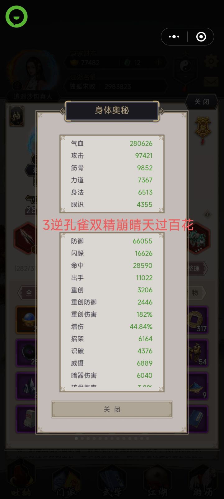 6. 弟子方面,腿妈命中跟我差不多,棍妈15000的样子,其他7000-10000不等,就是摸奖,刀枪是为了赌传承打出上限,剑国际惯例挡第一棍就是最大的贡献![[表情_送花]](https://img-tc.tapimg.com/market/images/68b3dc8473df915ad2b85da5efef4f56.png)