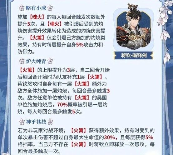 大幅提升“魂火”的触发次数,让蒋钦辅助能力上限提高,并且完全移除了“魂火”导致的受到灼烧伤害增加的负面,基本变为纯正面收益。“火篱”的引爆范围也被限制,还附带了一点攻防。总的来说略有小成主作用是基本移除原有的自身技能负面效果。