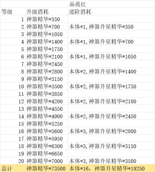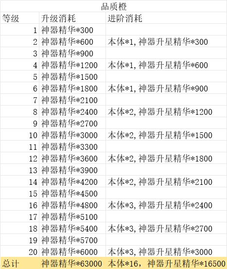 神器进阶消耗一览
