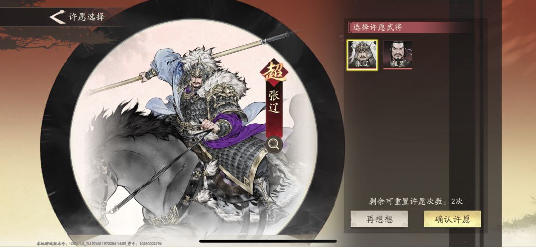 当前测试自选武将开放的是程昱和张辽。除了喜欢程昱的xp党玩家外,我都推荐优先抽取张辽。