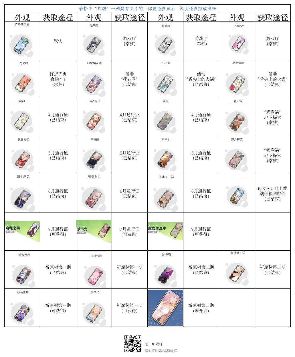 我把能找到的、现在能在游戏里见到的手机壳(外观)整理了一下,如果有漏的或者错误的求告知。最下方有最新表格的链接如果发现新的会更新,点击下方表格链接即可查看最新表格[心动小镇_点赞]#开放空间 #...