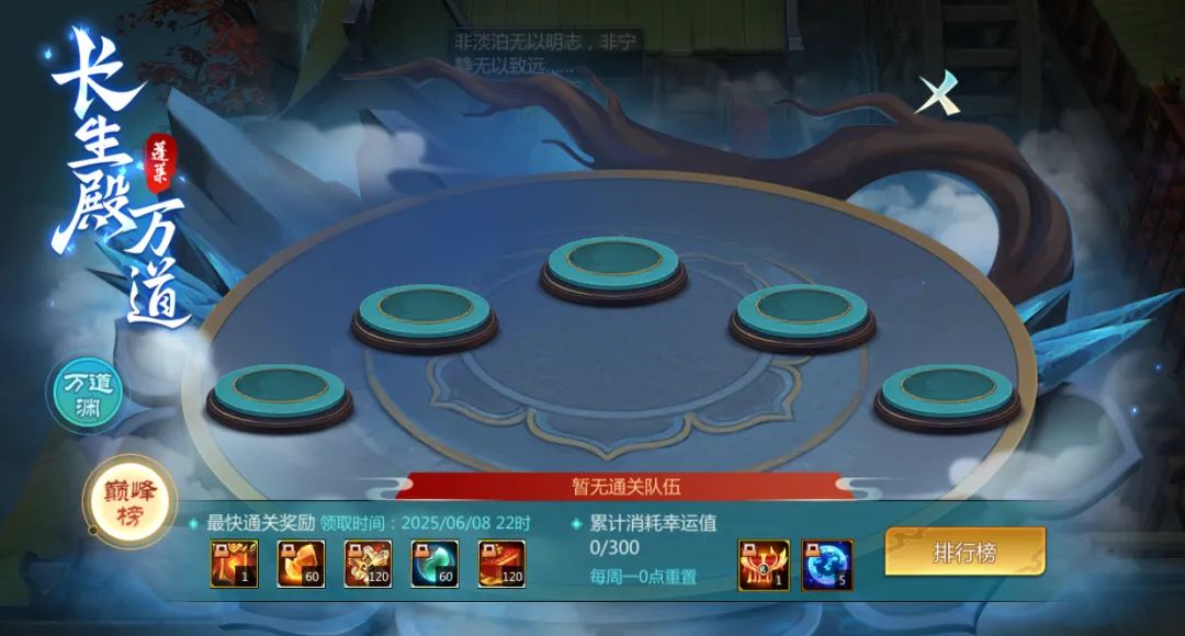 唯有强者方可问鼎巅峰!通关挑战长生殿*万道[激怒]模式用时最短的前100名玩家将上榜。排名截止时,巅峰榜第一名队伍的每名队员都可领取最快通关奖励——