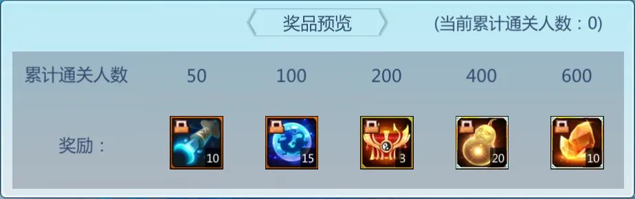 奖励如下,通关人数达到600人时,总计可获得月之匙*10、高级虎符精元*15、蓬莱仙材礼盒*3、蓬莱仙魄*20、星海凝翠*10。