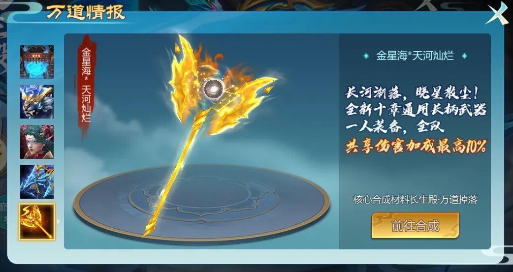 全新十章通用长柄武器「金星海*天河灿烂」开启合成!一人装备,全队共享最高10%的伤害加成!
