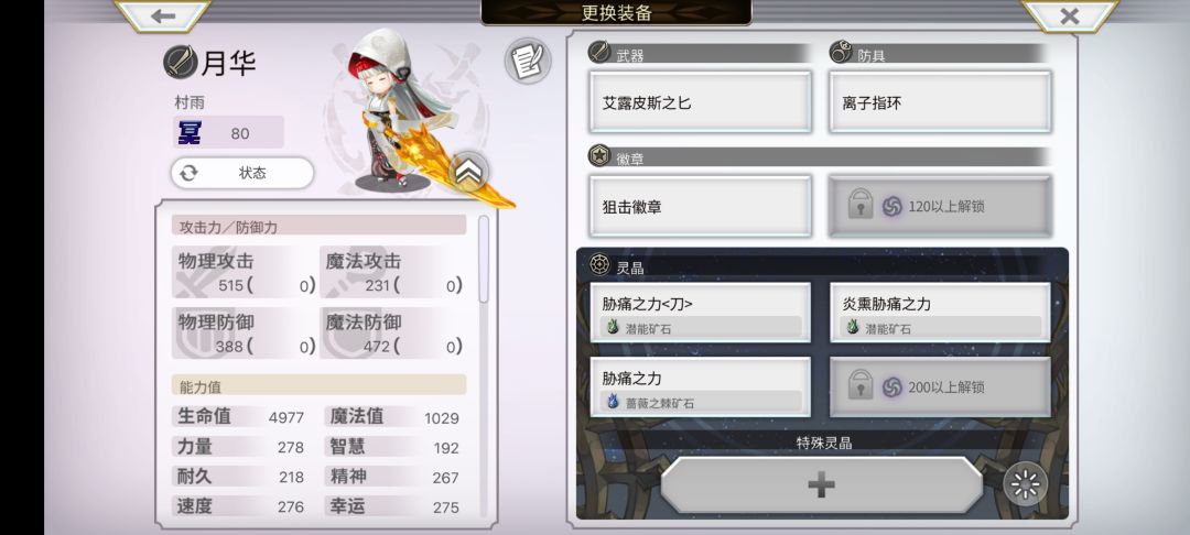 可以灵晶上狙击,然后戴托托50力/mp月华是我开服第一个角色,同时也是我回归后用圆玉觉醒的第一个角色,本来80+级正常玩随缘升级,为抄作业吃书拉满级了