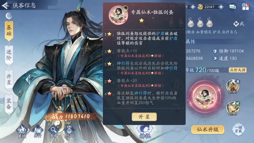 专属九星提升了神行符对自己的影响,加上初始被动就是20%的生命值回复和500点怒气回复,能力确实不错,不过对于一个肉坦来说,收益不是很高。整体来看阴阳剑圣的专属一星就是完全体,其余的看自己的能力和对剑圣的喜爱程度就好。
