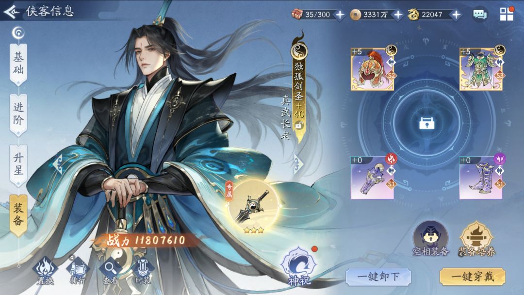 属性推荐:速度》生命》防御、减伤……在战斗中,阴阳剑圣速度是非常重要的,速度快可以更快引爆剑痕,更早叠加剑芒,输出和防御都需要速度。其次的生命属性则涉及到剑芒护盾的厚度,以及专属一的伤害,也是阴阳剑圣非常重要的属性。