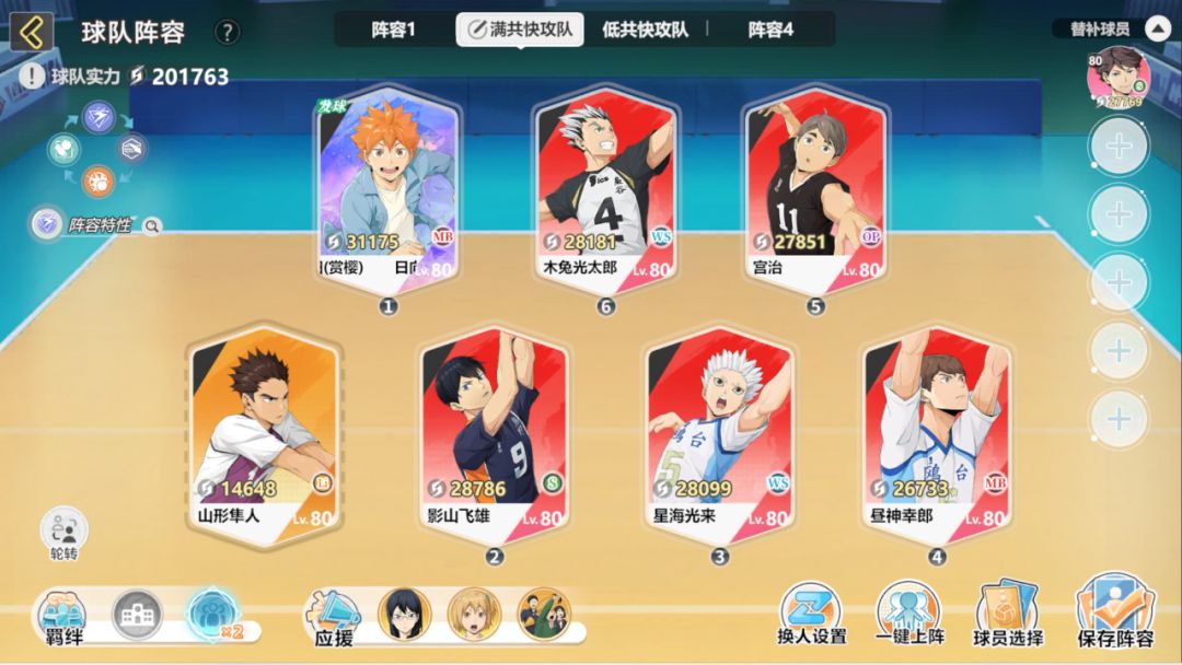 因为SP研磨还没出,所以目前最适合的配队就是和影山组成超强上限快攻队,因为大招CD有点久,所以需要宫治和WS补上真空期。带隼人是因为高反应可以给翔阳刷训练技BUFF,但是隼人如果没有高共还是带夜久比较好。如果是新入坑的玩家,可以保留影山+日向,等SP西谷出了抽西谷,没有就用送的赤木替代,OP位用大地后排用自由人替换掉就可以,如果替换后排OP需要调一下位置。WS位置可以用岩泉田中这类通用且强力的球员替代。