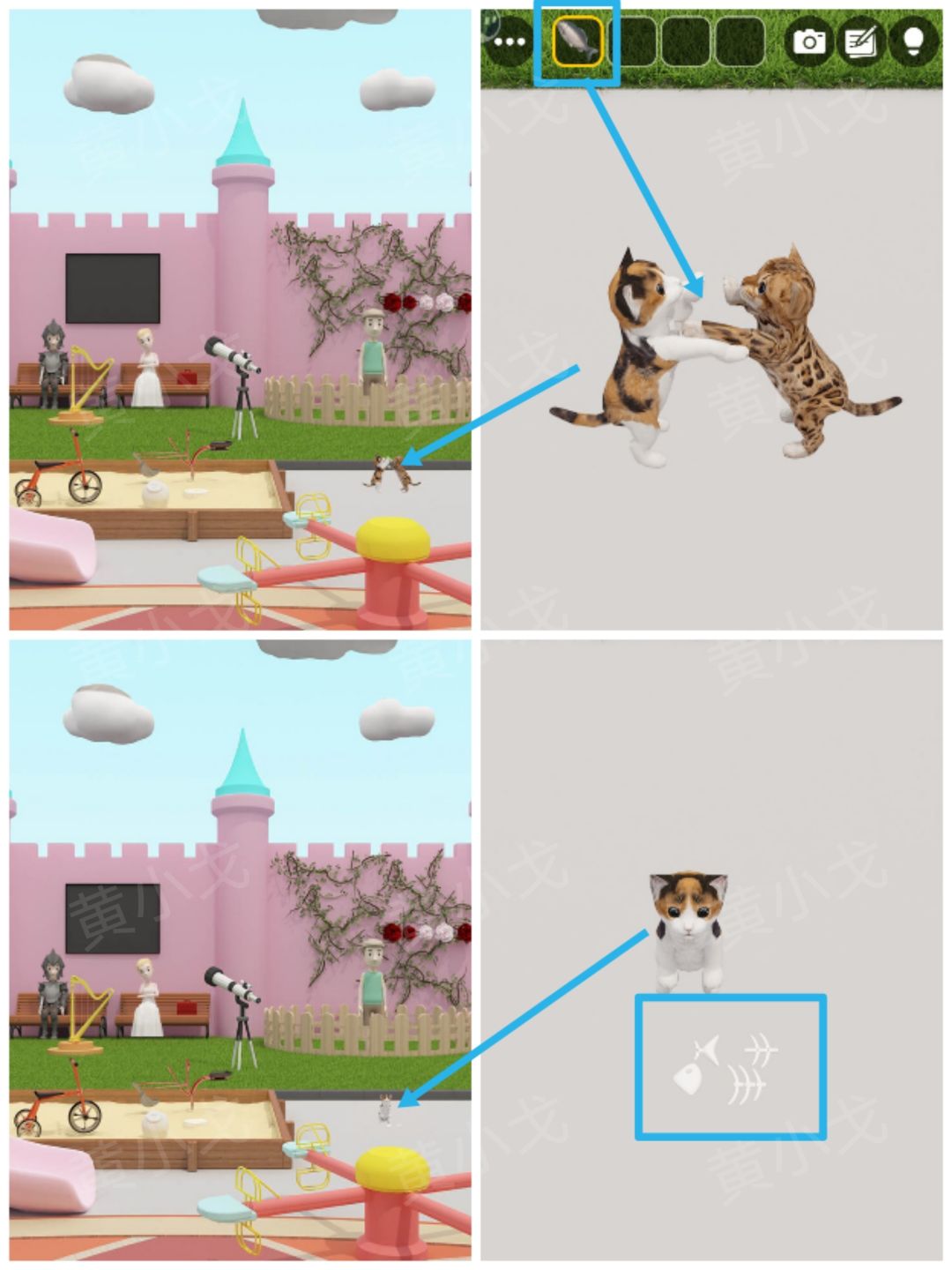 8.点击地上的猫,拿【鱼】给小猫咪;查看地上的鱼骨头