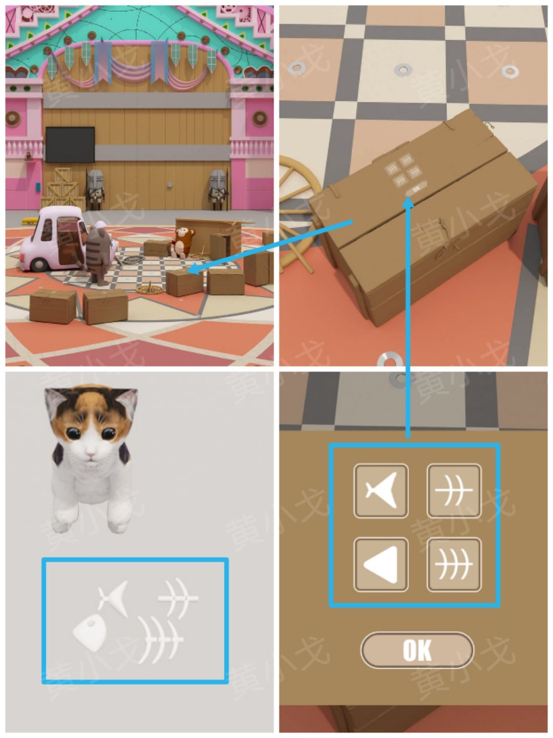 9.点击地上的第三个箱子上的密码锁,根据[儿童区]鱼骨头现状线索,调整密码锁