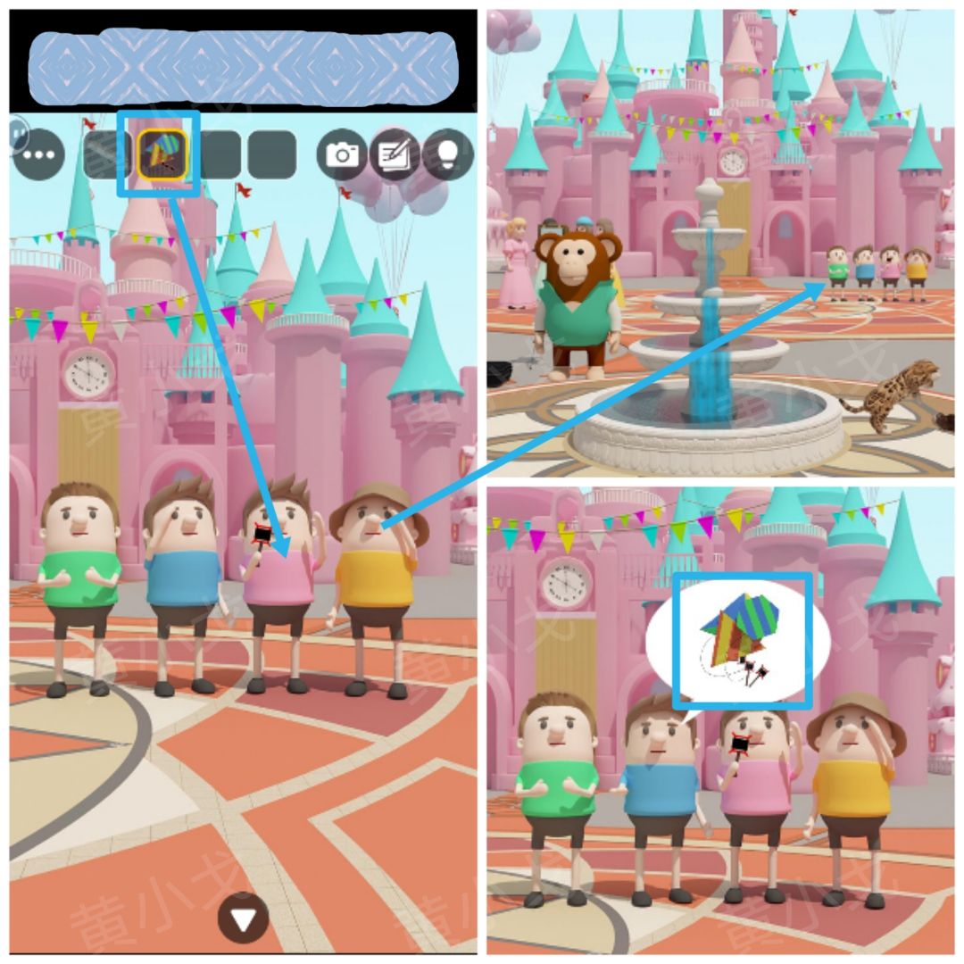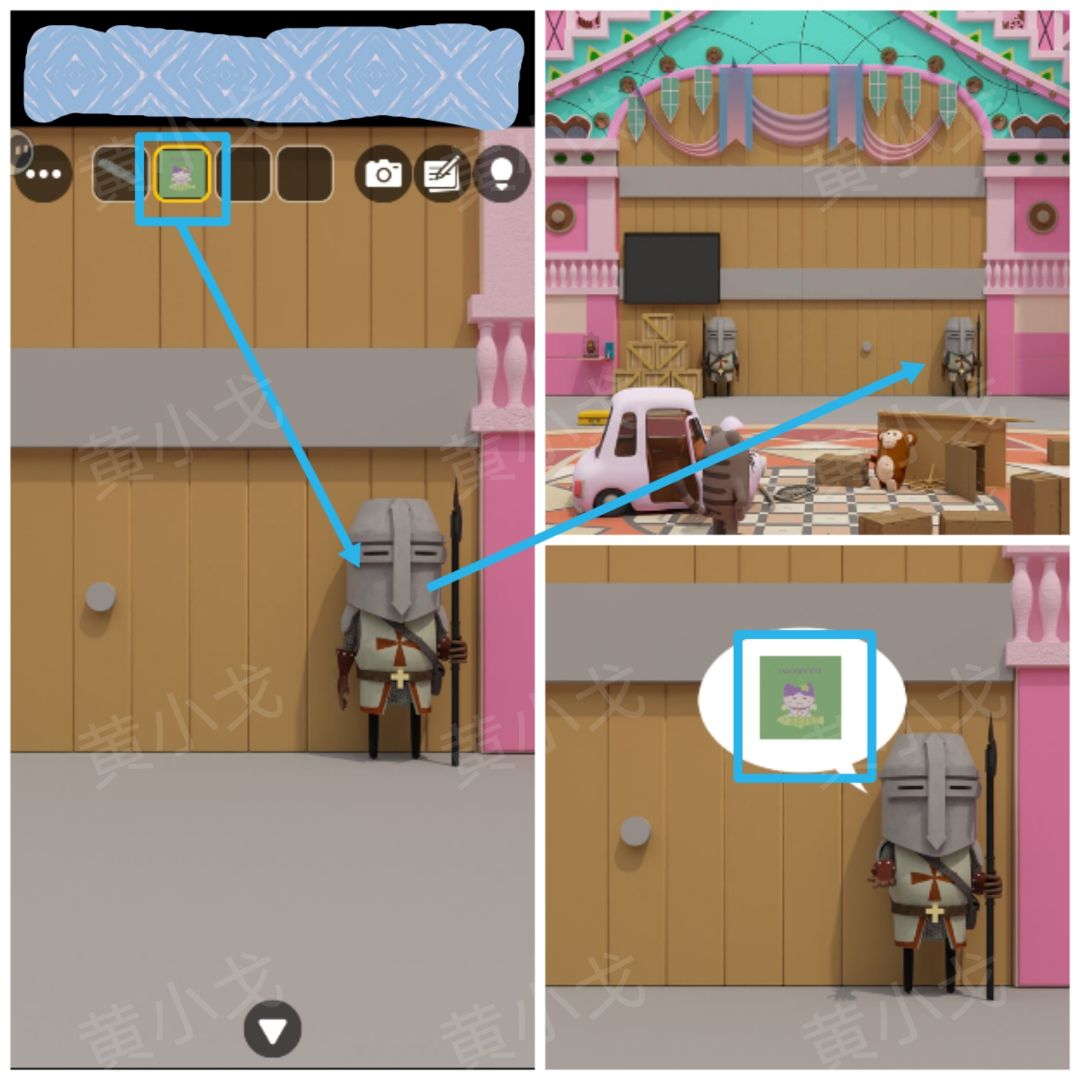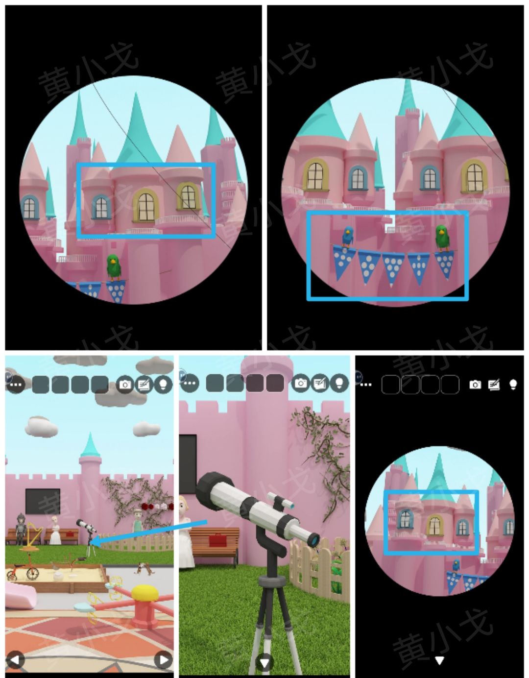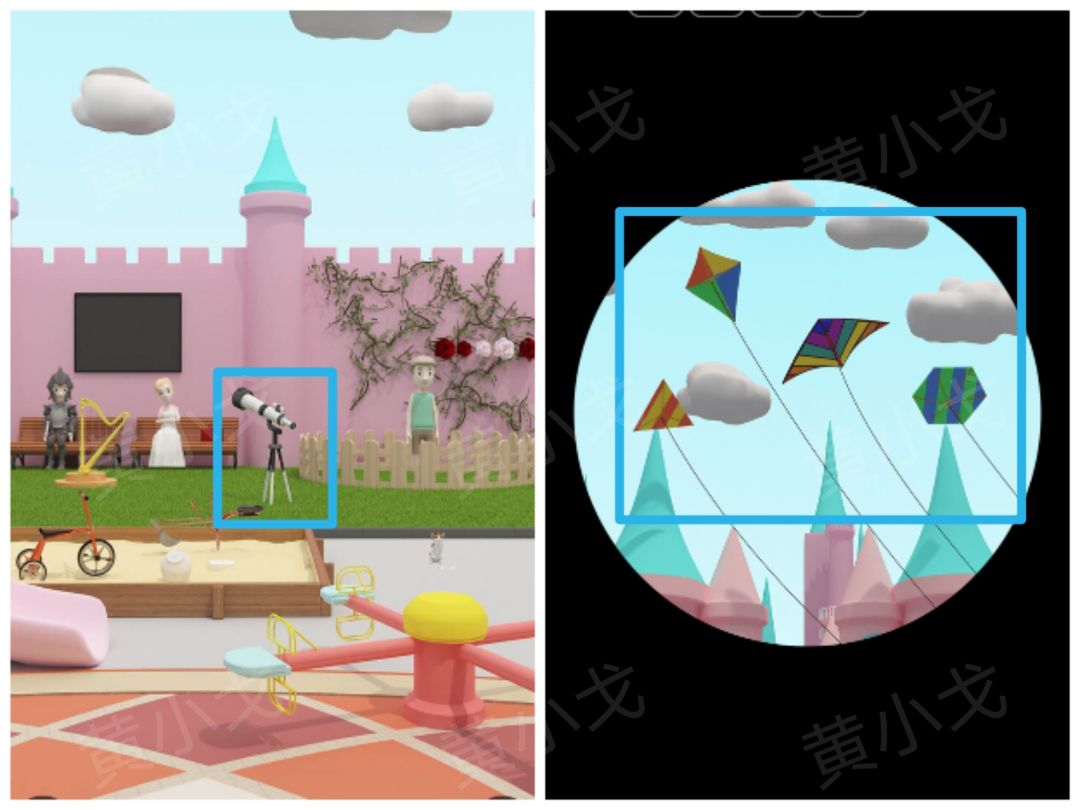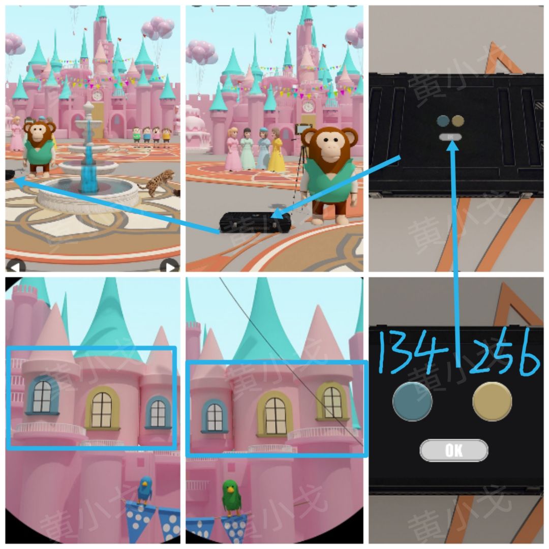 26.点击摄影师的箱子,根据[儿童区]通过望远镜看到的窗户颜色线索,按顺序按下按钮