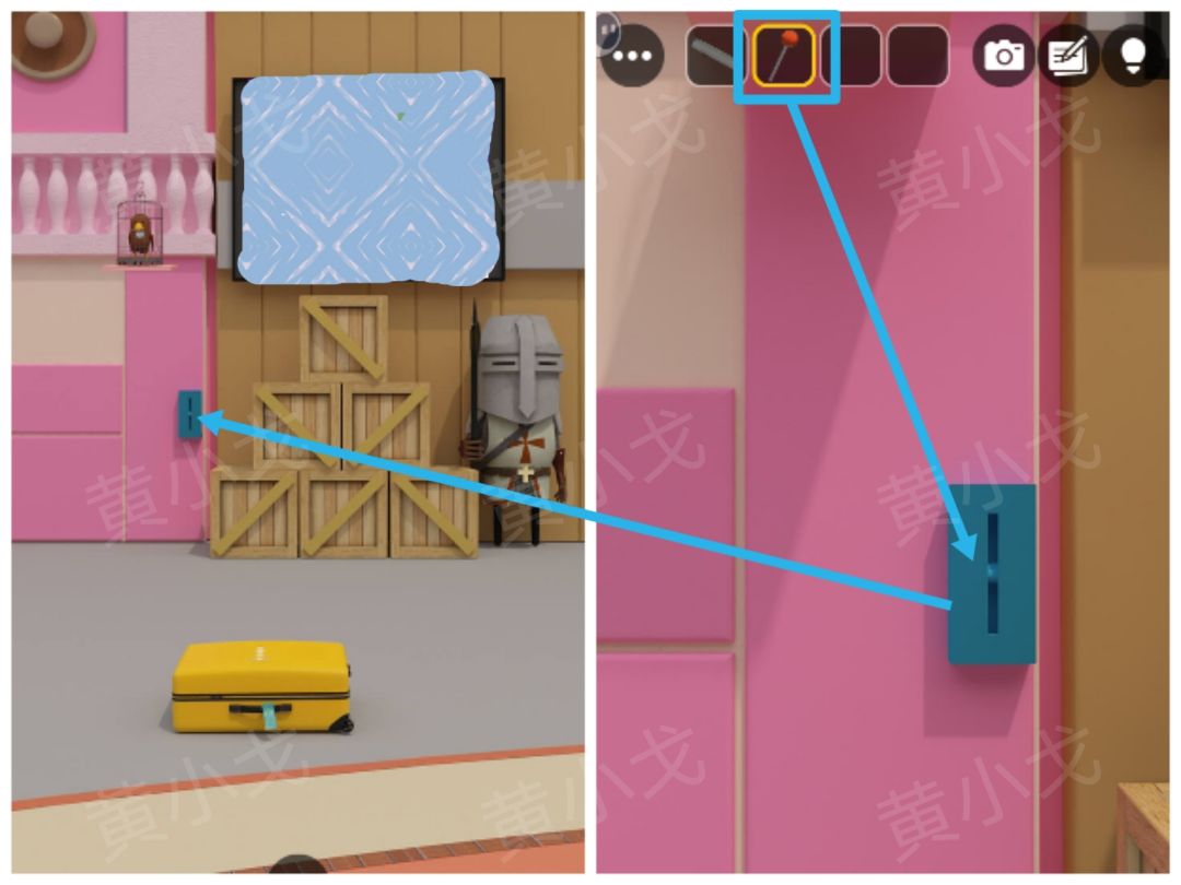 30.点击墙上的机关,装上【操作杆】,降下鸟笼