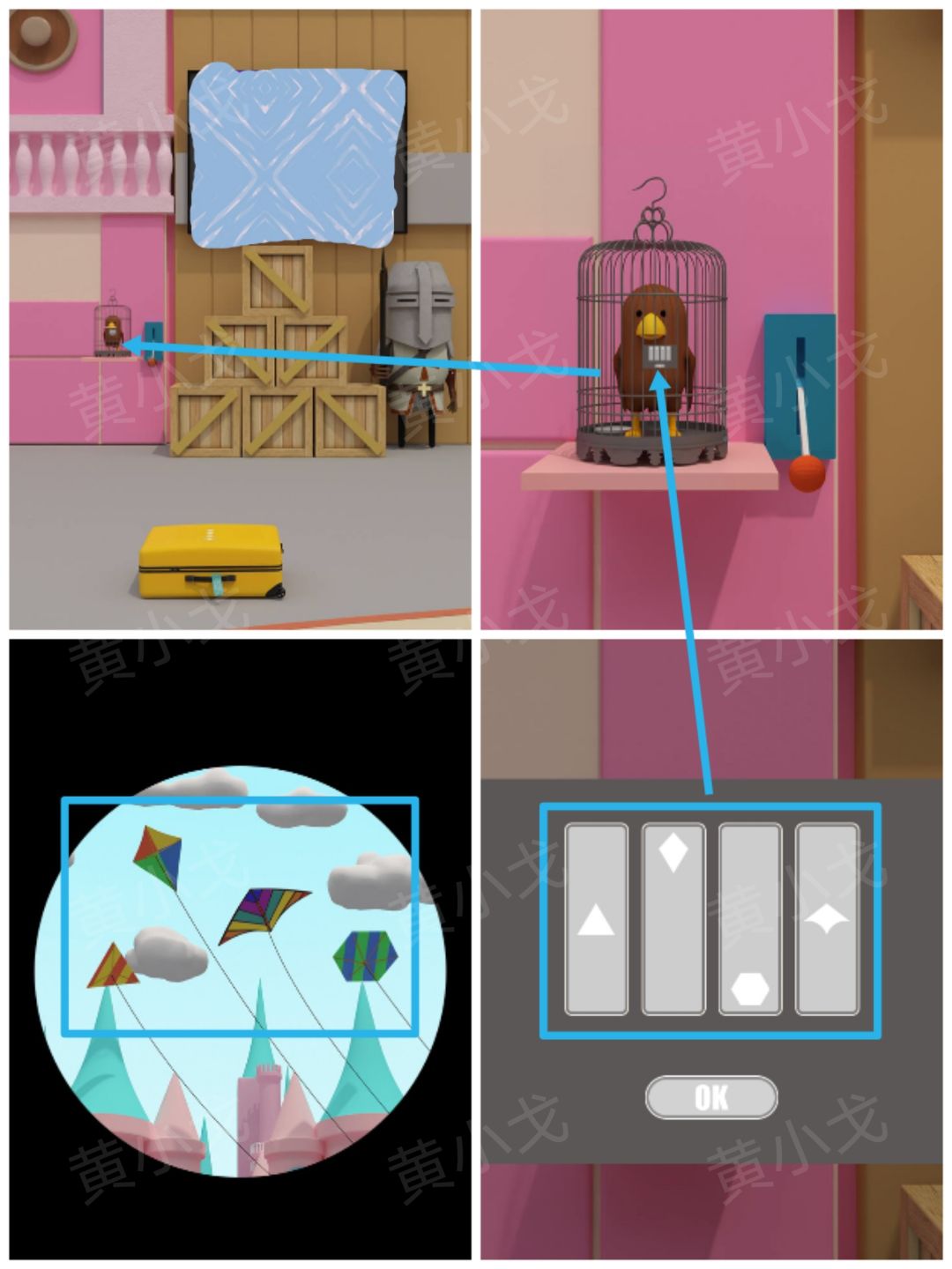 31.点击鸟笼上的密码锁,根据上面的图形提示,结合[儿童区]通过望远镜看到的风筝线索,调整密码锁