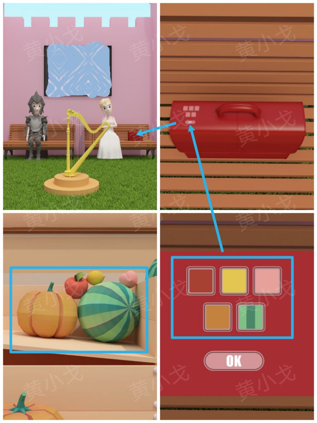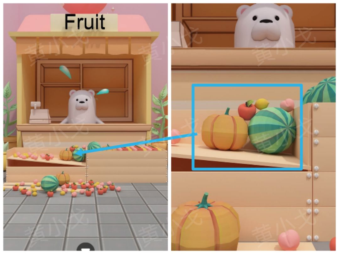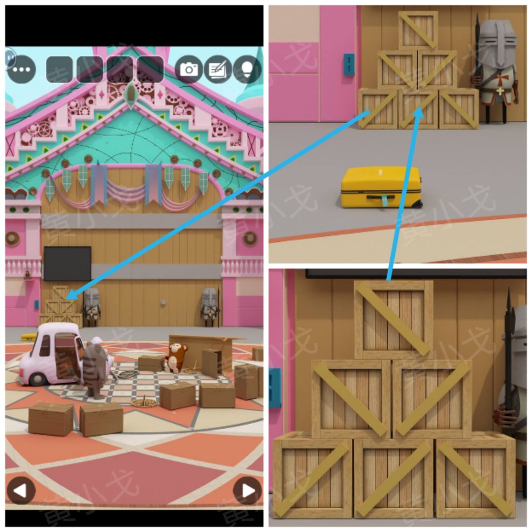 6.点击水果店旁左侧箱子上的密码锁,根据[大门]场景木箱上的线索,调整密码锁