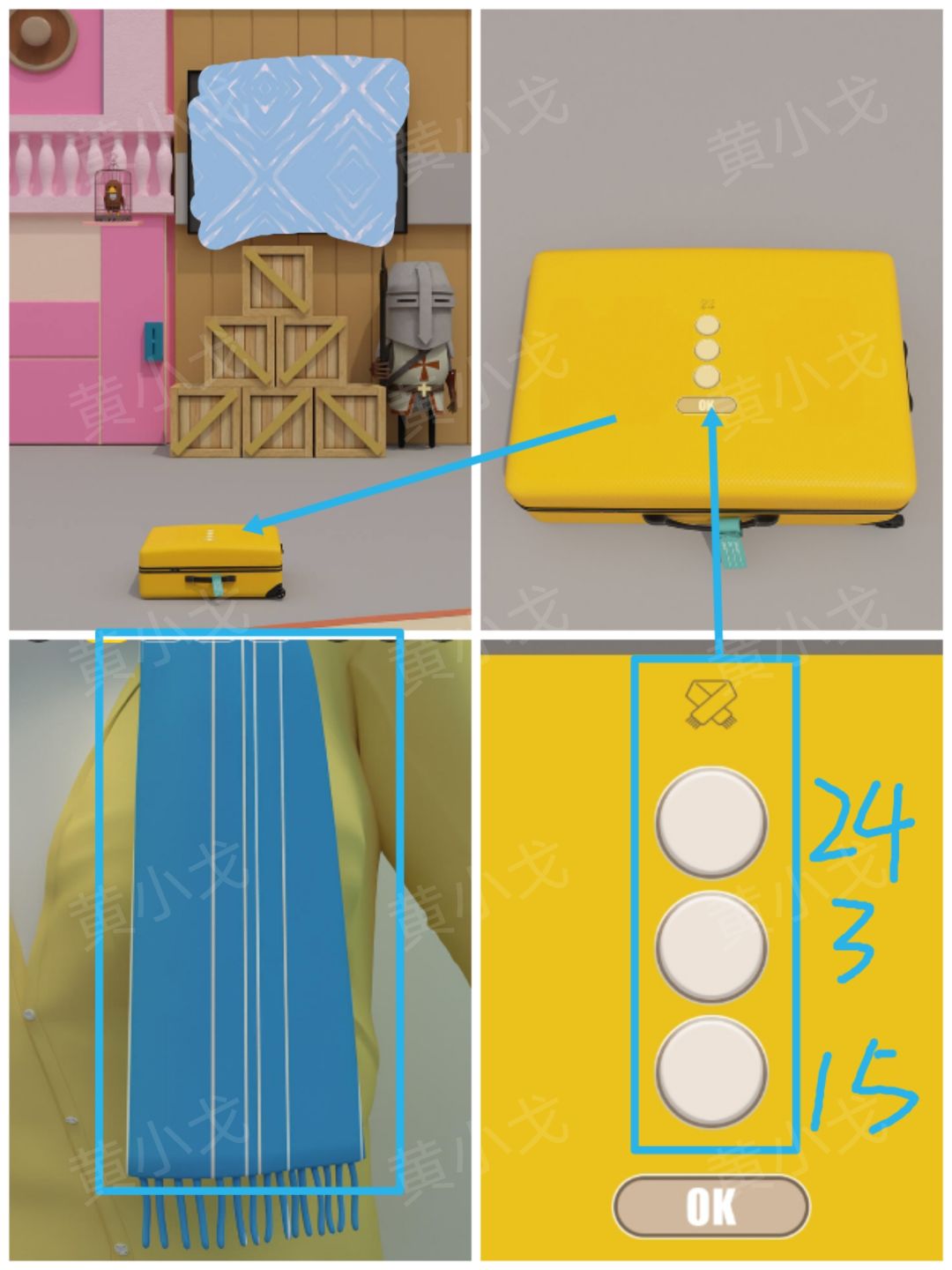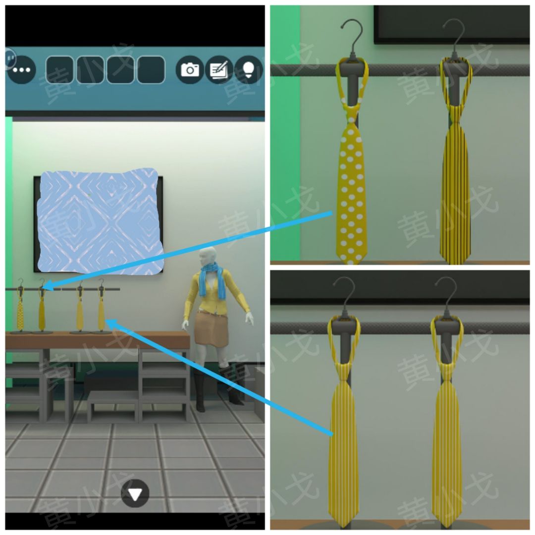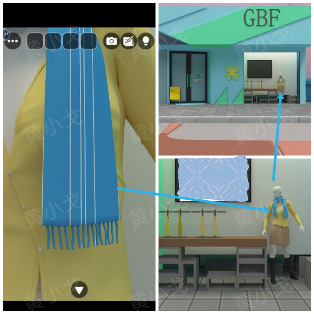 15.点击黄色行李箱上的密码锁,根据上面的围巾图案提示,结合[商业街]场景模特身上的围巾线索,按顺序按下按钮