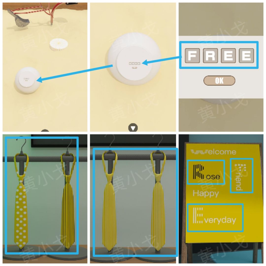 21.点击沙坑里的罐子上的密码锁,根据[商业街]服装店招牌和领带上的线索,输入密码:FREE