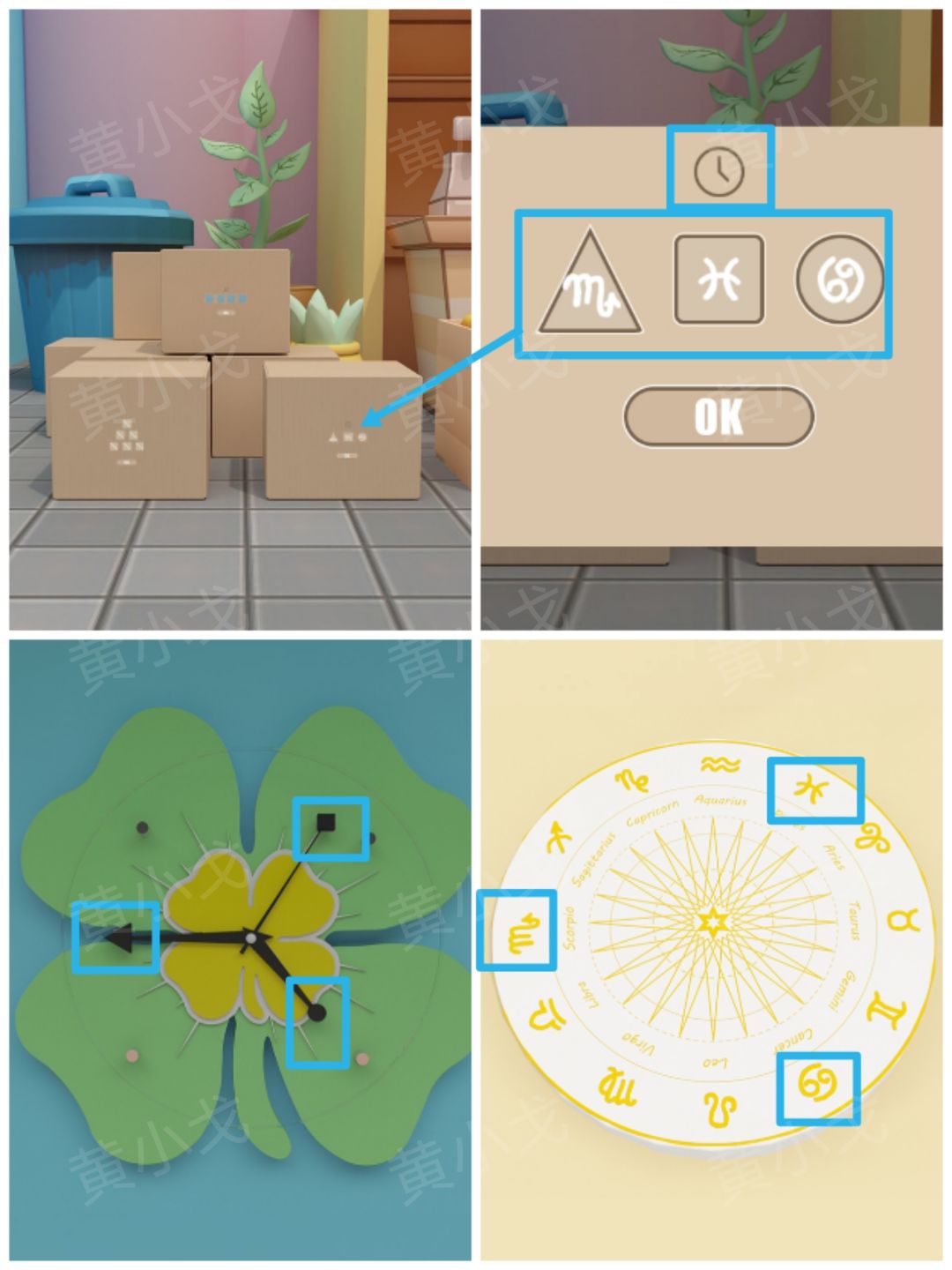 24.点击水果店右侧箱子上的密码锁,根据上面的时钟图案和图形提示,结合该场景时钟和[儿童区]场景星座盘上的线索,调整密码锁